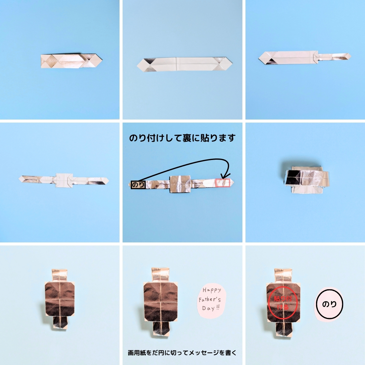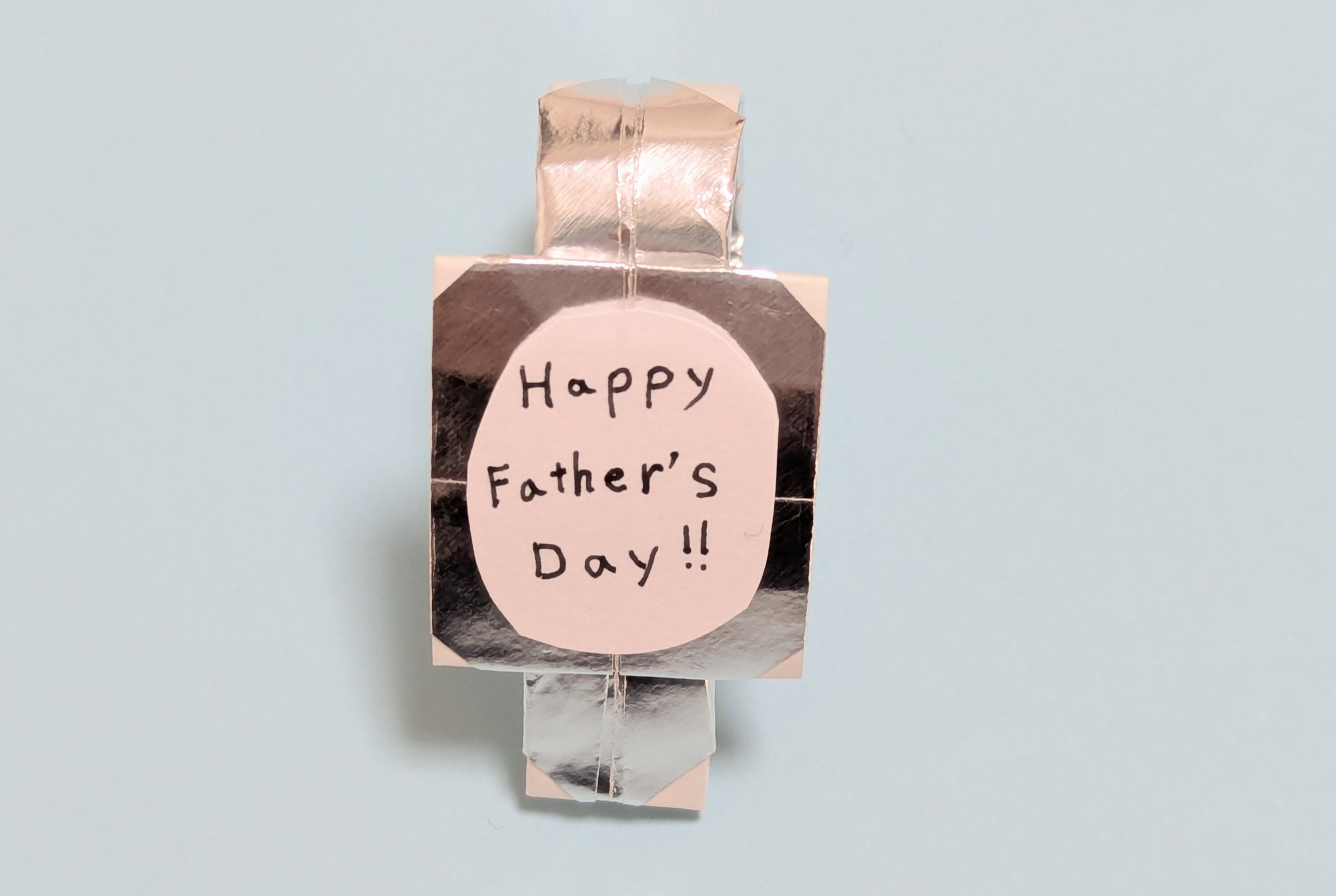 「いつも時間をくれるお父さんへ、今度は私たちから“ときめき”をプレゼント。」そんな思いを込めて、今年の父の日は子どもと一緒に“銀色折り紙”で腕時計型のメッセージカードを作ってみませんか?